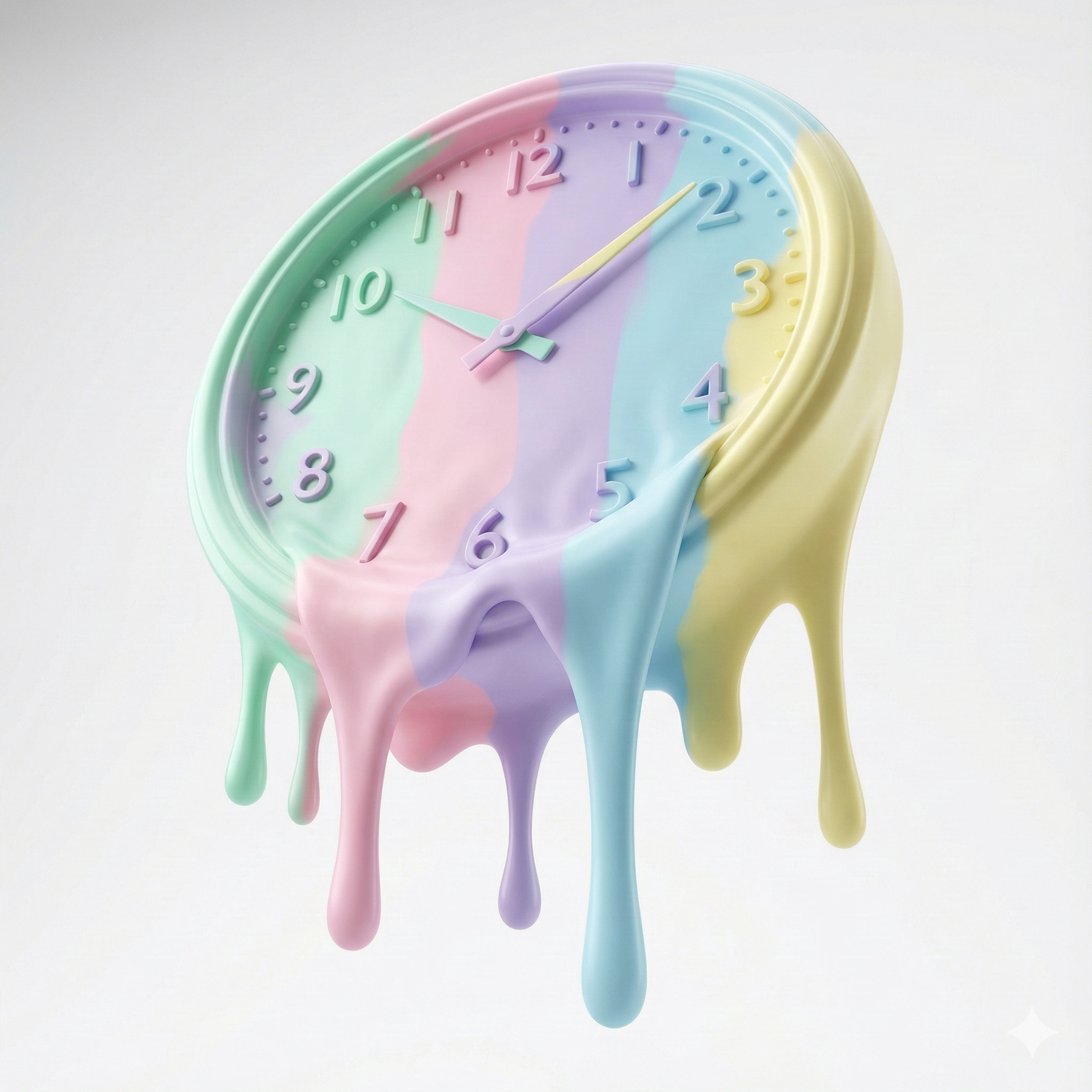 Create a hyperrealistic poster of an [wall clock] suspended mid-air with a [1:1] aspect ratio, seamlessly melting and deforming from intense heat as if made of thick, viscous wax, with the surreal effect applying uniformly to all its parts regardless of their original material. Each distinct component bold yet soft pastel color, melting in a smooth, matte, and aesthetically pleasing manner. The shot is a dynamic low-angle view emphasizing the distortion, illuminated by soft, diffused lighting against a clean, bright background, rendered in a vibrant pastel color palette to achieve a stylish, hyperrealistic 3D model appearance.