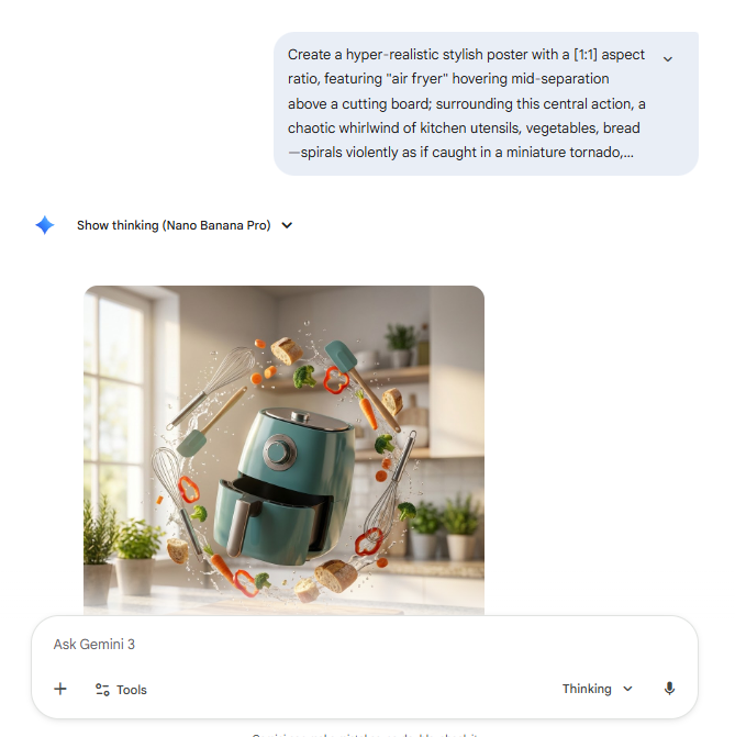 Create a hyper-realistic stylish poster with a [1:1] aspect ratio, featuring ["air fryer"] hovering mid-separation above a cutting board; surrounding this central action, a chaotic whirlwind of kitchen utensils, vegetables, bread—spirals violently as if caught in a miniature tornado, with hyper-detailed, juicy splatters and water droplets frozen in motion, all illuminated by soft, volumetric daylight pouring in from a large window off-camera, creating a sense of depth and dimension with soft shadows and highlighting the textures, set against a softly lit, out-of-focus kitchen background, using a vibrant and naturally lit color palette dominated by the Blender portable's fresh hues contrasted with water and metallic accents, rendered in a sharp, photographic style with subtle motion blur to emphasize the dynamic yet naturally lit movement of the scene.